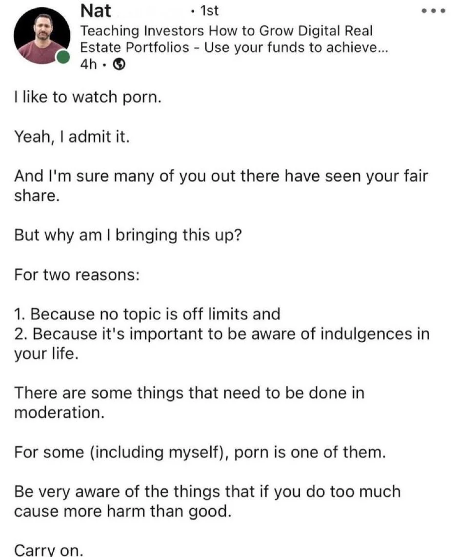 There is a time and place for that sort of thing. And if anyone knows about moderating yourself, it’s the guy who posted about his porn viewing habits on LinkedIn.